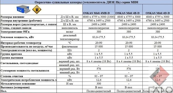 Тепловая мощность покрасочной камеры варьируется в зависимости от типа обогрева (дизельный, газовый и.т.д).